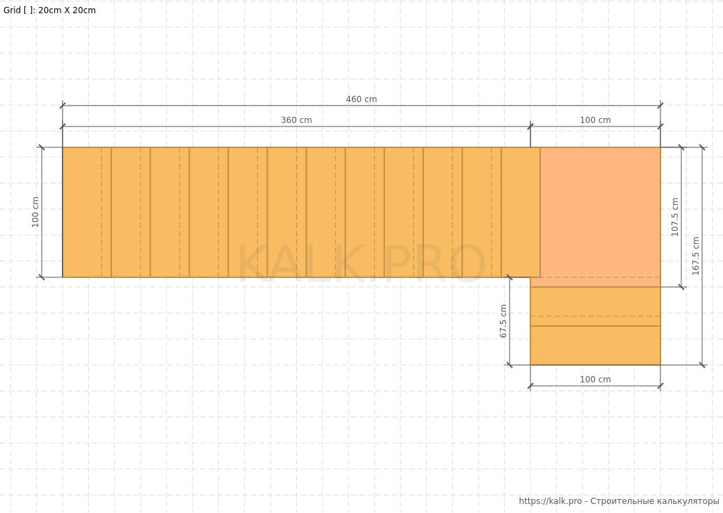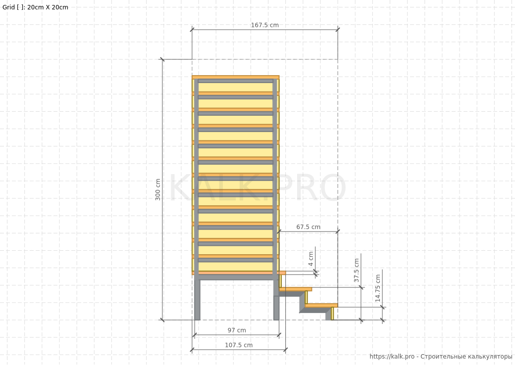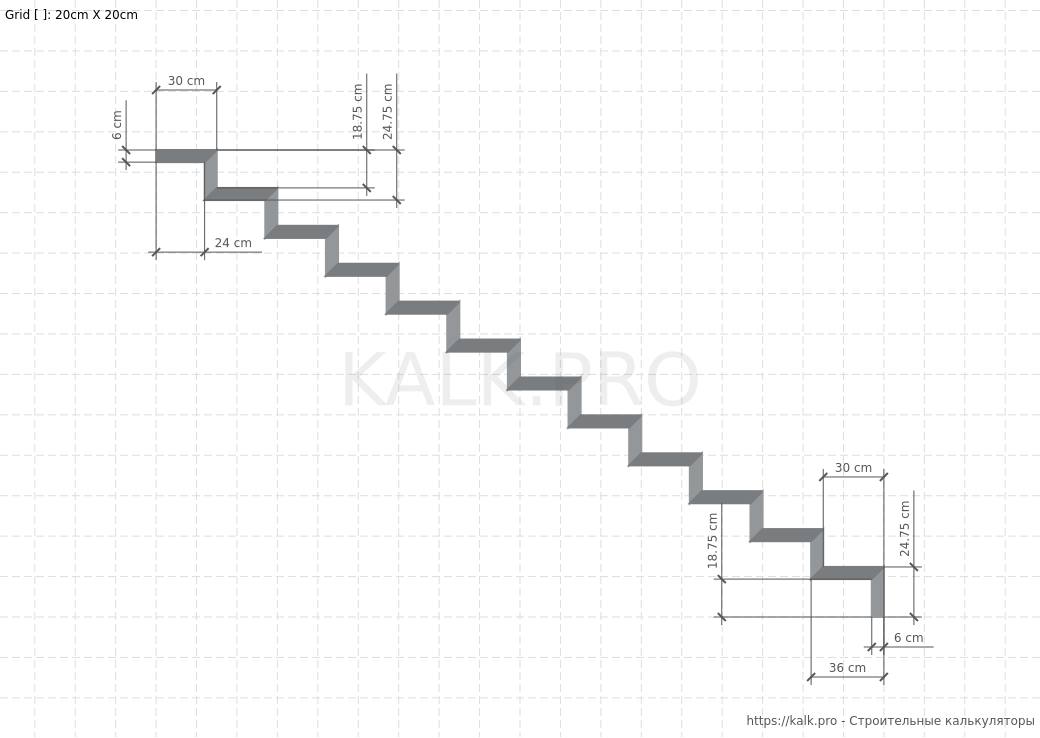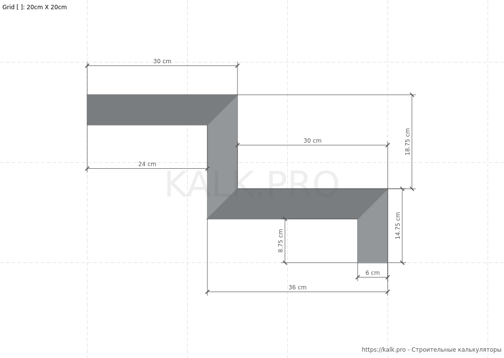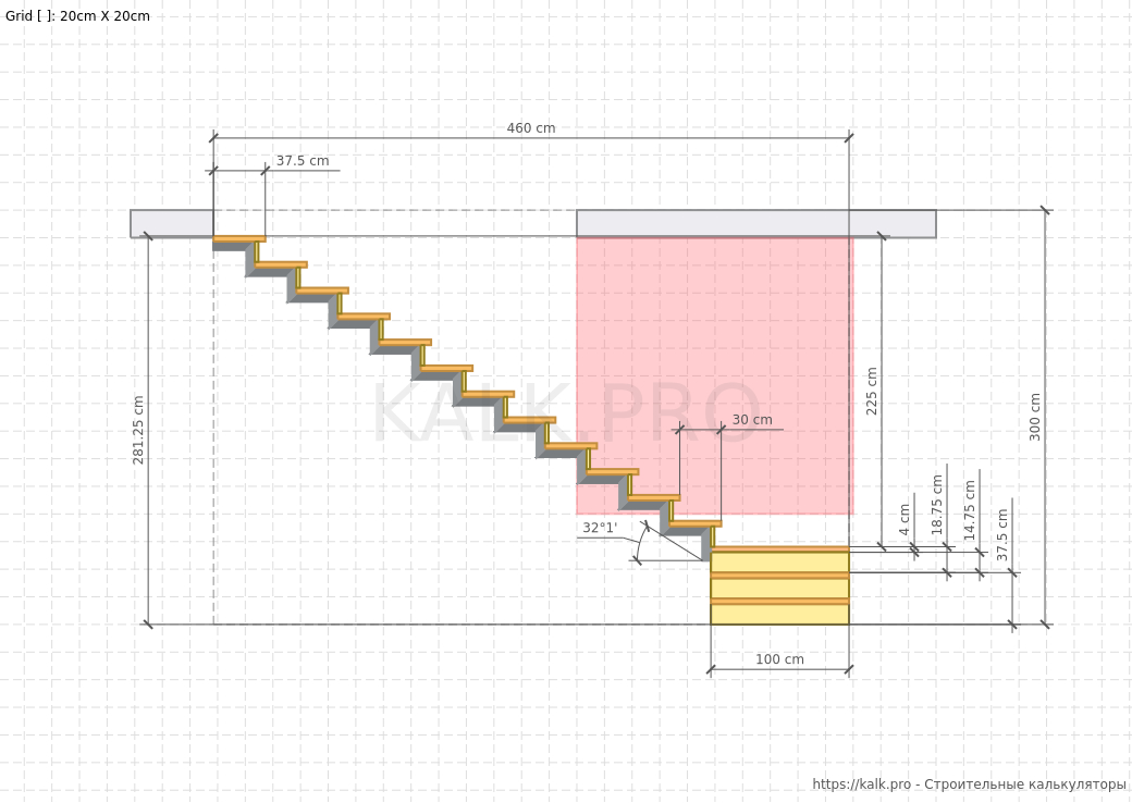* требуется только для визуализацииШаг 15. Внимательно проверьте все значения и выполните расчет Г-образной металлической лестницы на 90° с площадкой, нажав на кнопку «Рассчитать» в онлайн-калькуляторе.